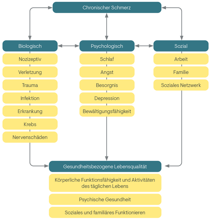 Etwas anders gestaltet sich die Lage bei unspezifischen Schmerzen. Trotzdem ist auch hier Unterstützung wichtig. So muss bei unspezifischen Schmerzen zunächst ein Weg gefunden werden, mit der Erkenntnis umzugehen, dass der eine Grund für die Beschwerden offensichtlich nicht existiert. Vor allem dann, wenn die Betroffenen einen regelrechten Ärzte-Marathon hinter sich haben, fällt es schwer, dieses (Nicht-)Ergebnis zu akzeptieren. Denn es stellt sich möglicherweise der Eindruck ein, man hätte sich bei diesem Resultat sämtliche Termine und Untersuchungen ebenso gut ersparen können. Gleichzeitig schwingt bei vielen die Angst mit, dass vielleicht doch etwas übersehen wurde. Unter Umständen bleiben darüber hinaus Restzweifel, ob das Resultat „unspezifisch“ zu akzeptieren ist oder ob die Diagnostik nicht vielleicht doch weitergetrieben werden sollte, um vielleicht trotzdem auf irgendeinen bislang übersehenen Auslöser zu stoßen. Im Umgang mit diesen Fragestellungen ist ein mehrdimensionaler Ansatz, der neben körperlichen auch mentale und soziale Aspekte einbezieht, von enormer Bedeutung. Ein derartiges Setting ermöglicht zudem die Vermittlung von Erklärungsmodellen für die Entstehung und Aufrechterhaltung von Schmerz. Solche Modelle illustrieren nicht zuletzt, dass Schmerzen mehr als einen Auslöser haben und von unterschiedlichen Faktoren beeinflusst werden. Eines der Standardmodelle in diesem Kontext ist das sogenannte „bio-psycho-soziale Schmerzmodell“[5], das vor allem bei chronischen Schmerzen zum Einsatz kommt. Es bildet auf leicht nachvollziehbare Weise ab, wie viele Bereiche des Lebens nach einer gewissen Zeit vom Schmerz betroffen sind. Damit bietet es eine Erklärung, warum Schmerz in so hohem Maße belastet und uns nicht nur körperlich, sondern auch in psychischer Hinsicht und in unserer sozialen Interaktion einschränkt: