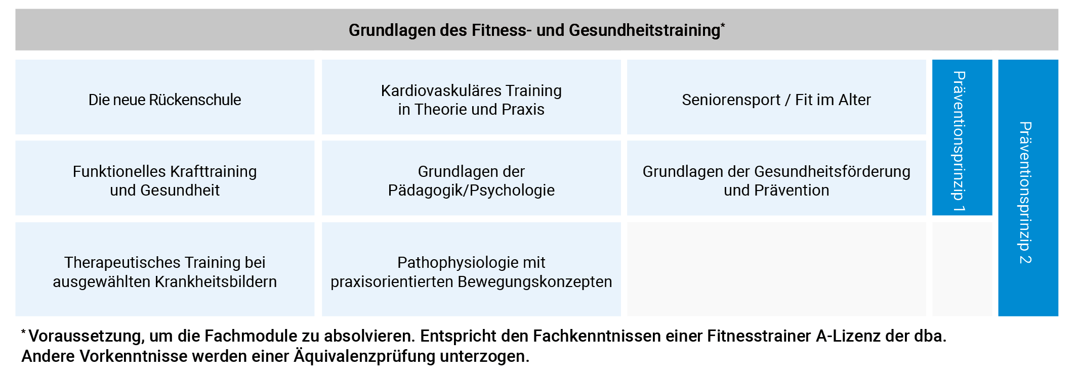 In den umfangreichen praktischen Teilen lernt man das Konzipieren von Präventionsprogrammen für die Bereiche aus dem Präventionsprinzip I sowie Rückenfit, Osteoporoseprävention, Lungensport, Core Training, Diabetes mellitus (Typ 2) Prävention, Wirbelsäulengymnastik, Beckenbodentraining, Arthroseprävention.