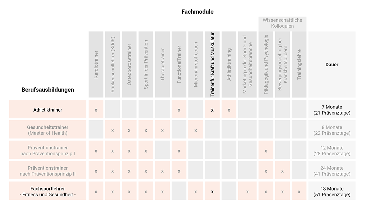 • Das Fachseminar „Trainer für Kraft & Muskulatur“ kann mit einer Klausur (60 min Bearbeitungszeit) auf Basis der Lehrmaterialien abgeschlossen werden. Nach bestandener Klausur erhält der Absolvent ein Zertifikat sowie eine Urkunde.
